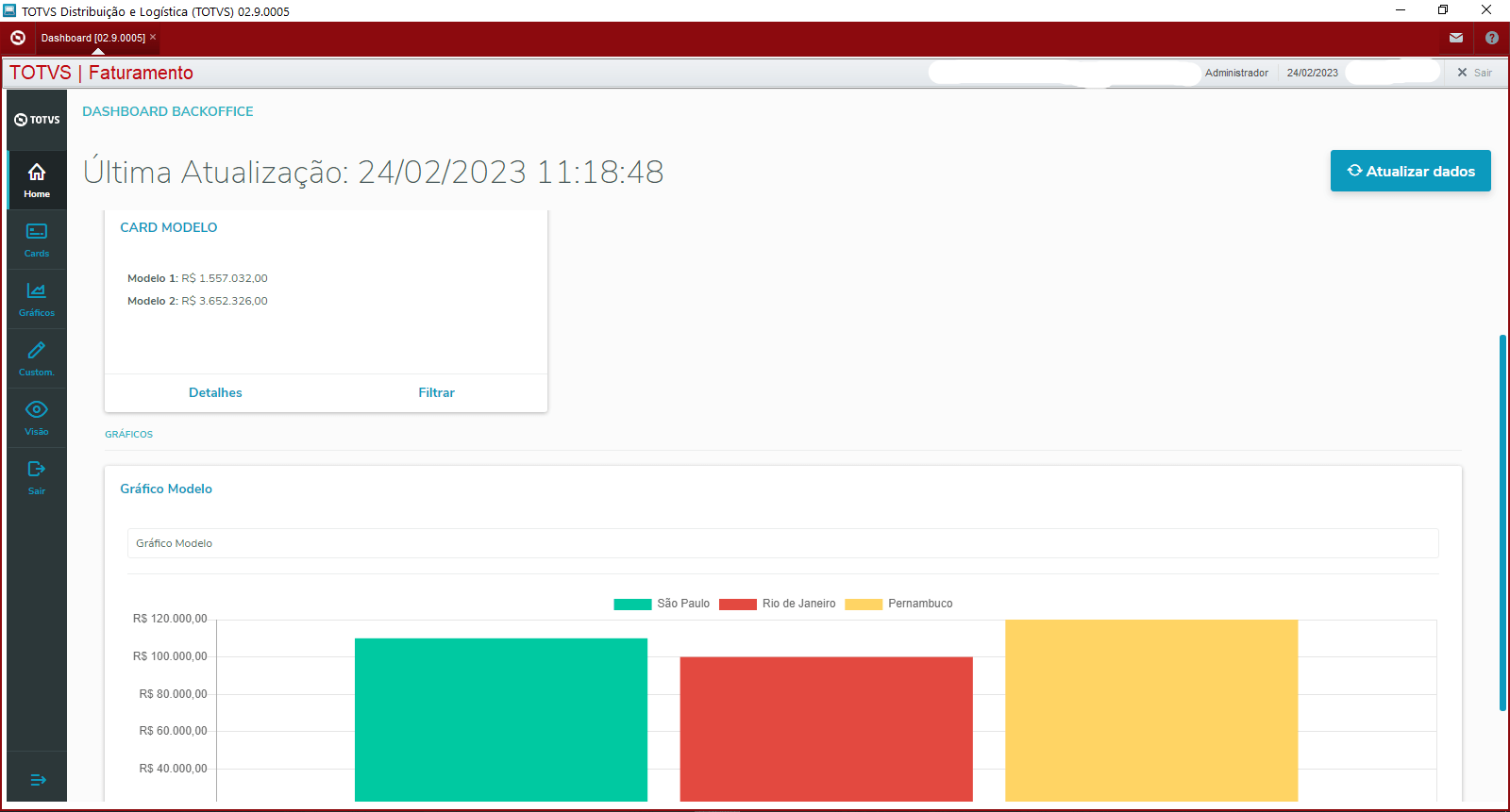 Outra novidade da release 12.1.2210, são os Dashboards. Os dashboards são painéis gráficos (divididos em gráficos e cards) para a realização de consultas aos dados do sistema: lotes de produto a vencer, pedidos em aberto, pedidos aptos a faturar, notas fiscais por estado, e outras informações de extrema utilidade para os gestores. A release já vem com alguns cards e gráficos pré-configurados, mas a rotina abre espaço para customizações que podem ser desenvolvidas pelos consultores do sistema.